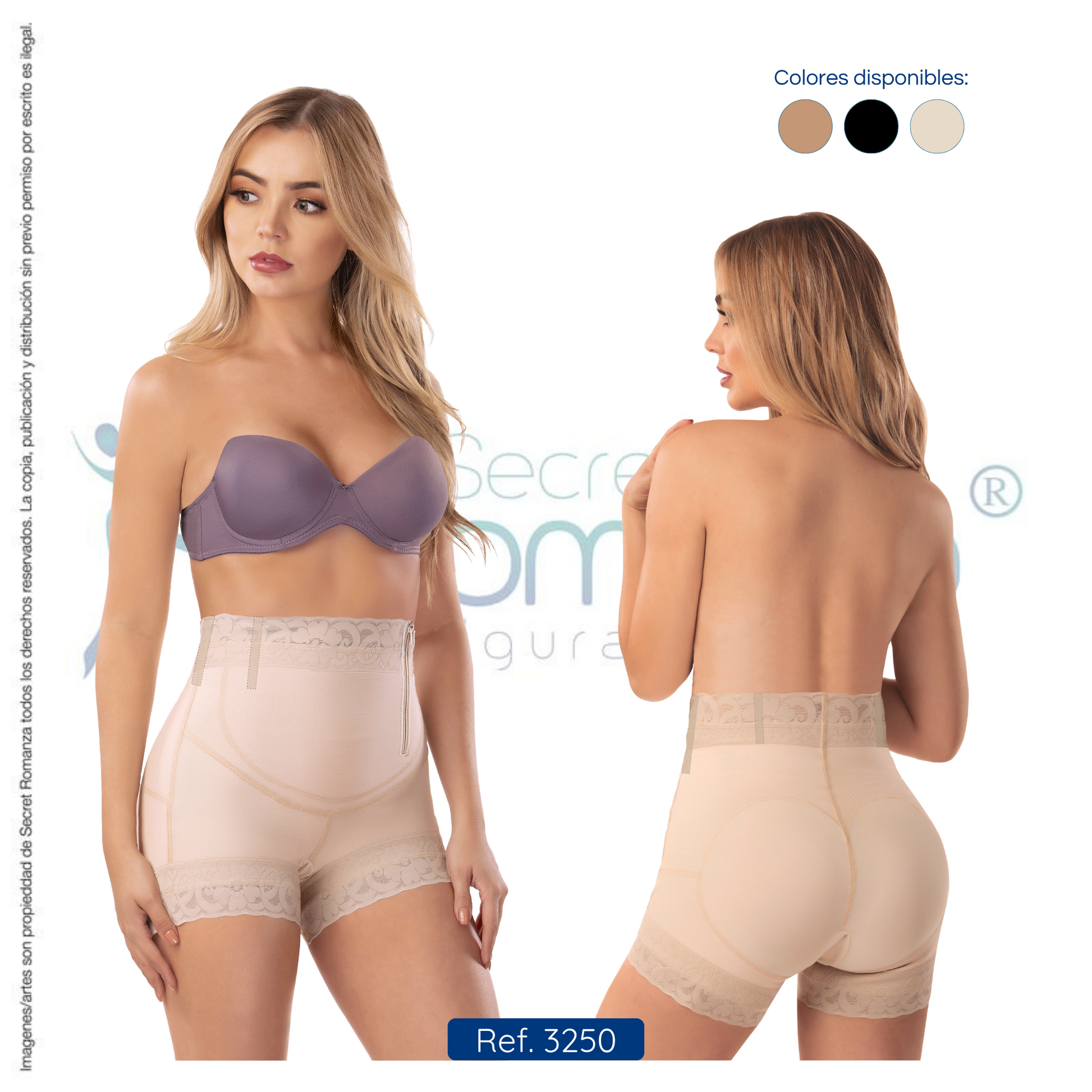Cachetero de Cintura Alta diseñado con encaje siliconado en la cintura y las piernas para un ajuste seguro y cómodo. Su corte glúteo en forma de corazón realza la silueta, mientras que el zipper lateral facilita colocarlo y ajustarlo. Además, cuenta con tapas perineales.